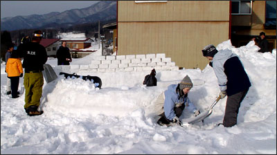 普段材木を使い建築物を作る者にとって全く未知なる世界へとなった。信州の自然を最大限に生かすというコンセプトの中で、雪でつくるコミュニティー空間「雪レンガカマクラ」を発案した。参加者約30名、その人数が収容できる巨大な雪レンガカマクラとは、ハッポウスチロールに雪を入れそれをかため、ブロック状にした雪を積んでいく方法である。通常の雪を山にしたカマクラよりも効率よく巨大化できるというメリットがある。